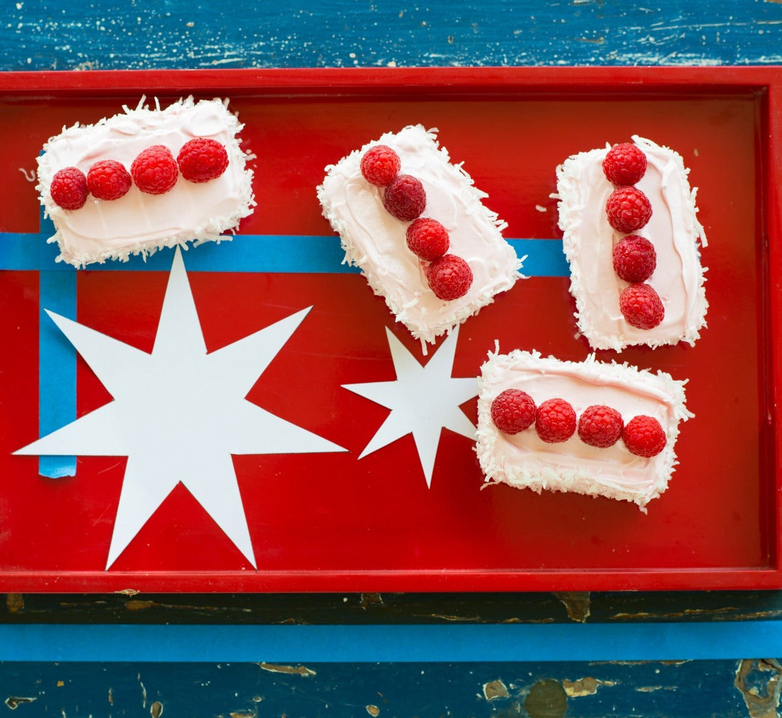 - When the cakes are cool, spread the coconut on a tray. Spread the raspberry frosting over the top and sides of a cake and then dip the sides in the coconut to coat. Place on a serving plate and place 4 raspberry halves down the centre on top to decorate. Repeat with the remaining cakes, frosting, coconut and fresh raspberries. Set aside for 30 minutes for the frosting to firm slightly before serving.