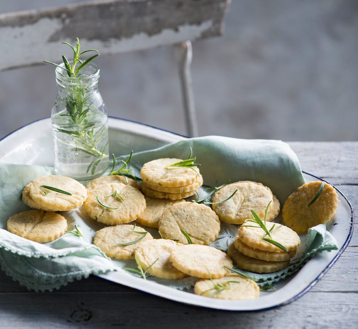 - Turn the dough onto a lightly floured surface and knead briefly until smooth. Divide the dough in half and use a lightly floured rolling pin to roll out one portion until 5mm thick. Use a 6cm round cutter to cut out discs and place on the lined trays about 2cm apart. Repeat with the remaining dough portion and any offcuts. Sprinkle the crackers with the extra rosemary leaves to garnish, and press lightly so they stick.