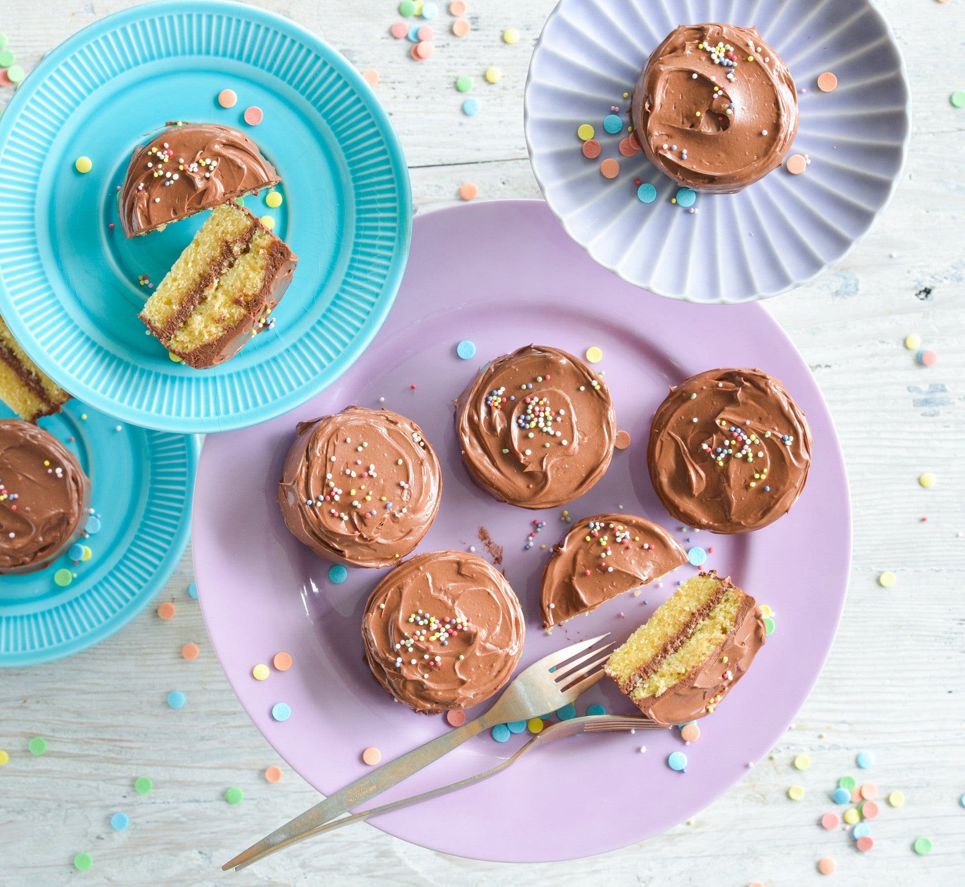 - Cut each of the cooled cakes in half horizontally. Use a palette knife or the back of a teaspoon to spread a little of the chocolate fudge frosting over the bottom half of a cake and sandwich with the top half. Spread the top and sides of the cake generously with some of the remaining frosting, swirling on top and making an indent in the centre. Decorate with sprinkles. Repeat with the remaining cakes, frosting and sprinkles.