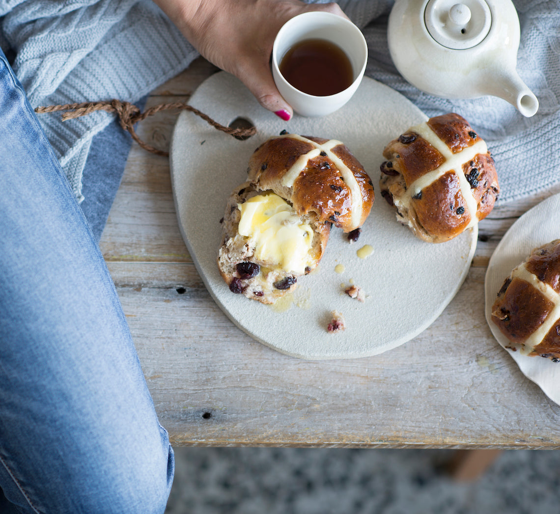 An updated version of the traditional favourite, these hot cross buns are studded with chunks of dark chocolate and tart, dried cherries. They're simply too hard to resist – especially when served warm with lashings of butter!