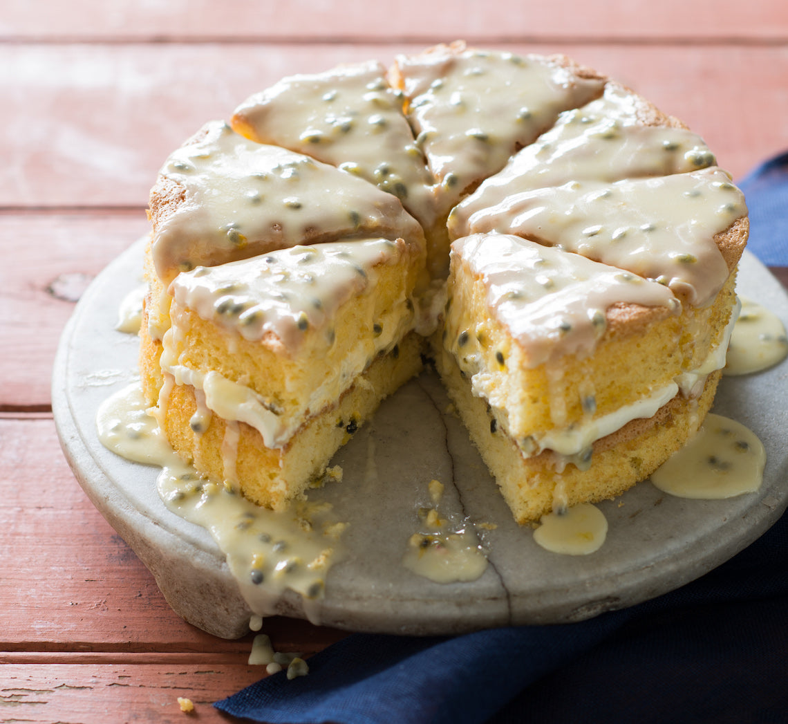 - When ready to fill, to make the Passionfruit Icing, sift the icing sugar into a medium bowl. Add the passionfruit pulp and enough boiling water to mix to a thin, spreadable icing. Cover tightly with plastic wrap and set aside. Use an electric mixer with a whisk attachment or a balloon whisk to whisk the cream in a medium mixing bowl until soft peaks form. Use a large metal spoon or spatula to gently fold the passionfruit pulp through the whipped cream until just swirled through. Place one layer of the sponge on a serving plate or cake stand and spread with the passionfruit cream. Top with the remaining sponge layer. Spread the Passionfruit Icing evenly over the top layer of the sponge, allowing it to drip down the sides slightly. Set aside or 20 minutes or until the icing sets before serving in slices.