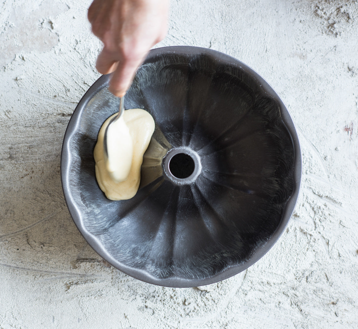 - Preheat the oven to 170°C (150°C fan-forced). Combine the 15g melted butter with the 1 teaspoon plain flour and use a pastry brush to grease a 2 litre (8 cup) Bundt or fluted ring tin (see Baker's Tips).