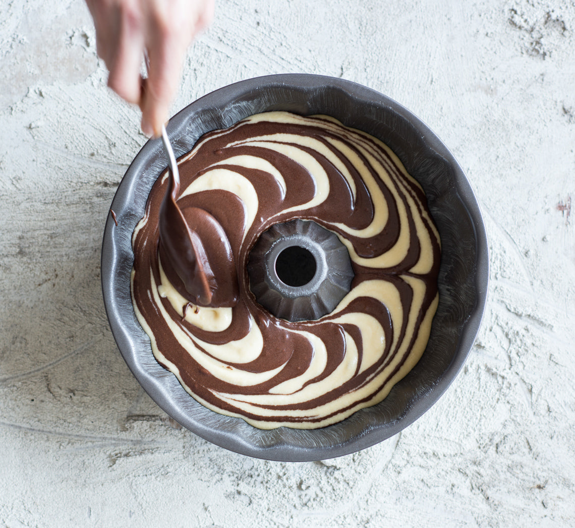 - Drop a large spoonful of the vanilla mixture into the prepared cake tin. Drop a large spoonful of the cocoa mixture into the centre of the vanilla mixture. Continue dropping alternating spoonfuls of the mixtures into the tin directly on top of each other until all the mixture is used. The mixture will spread and even out as you add more, creating the ‘zebra’ pattern.