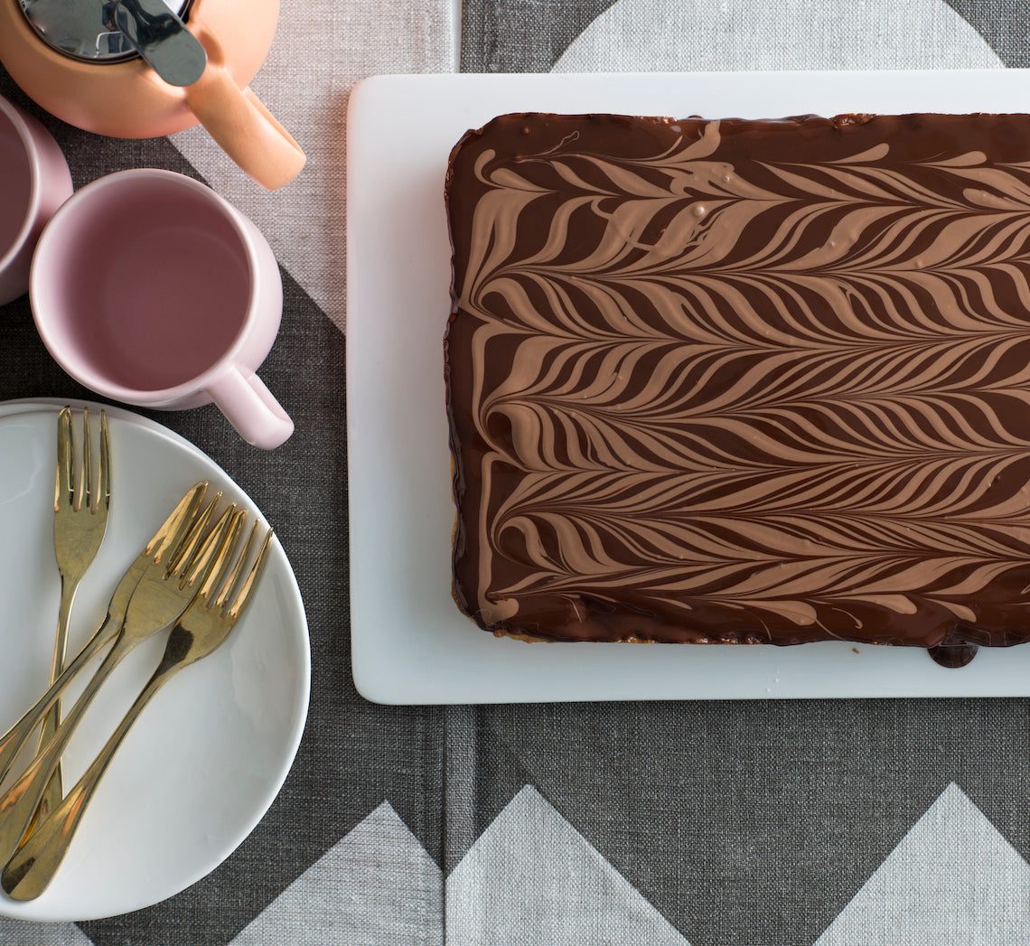 - Preheat oven to 160ºC (140ºC fan-forced). Grease a 16cm x 26cm shallow slice tin with melted butter and line the base and long sides with one piece of baking paper.