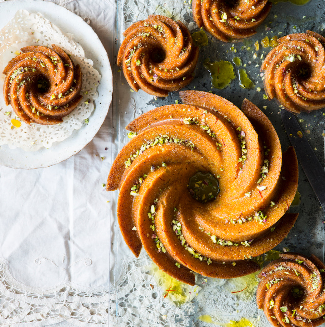 - Turn the cake onto a serving plate or cake stand with a lip. Gradually pour the hot saffron syrup over the cake, allowing it to soak in. Set aside and allow to cool (this will take about 1 hour). Serve sprinkled with the chopped pistachios.