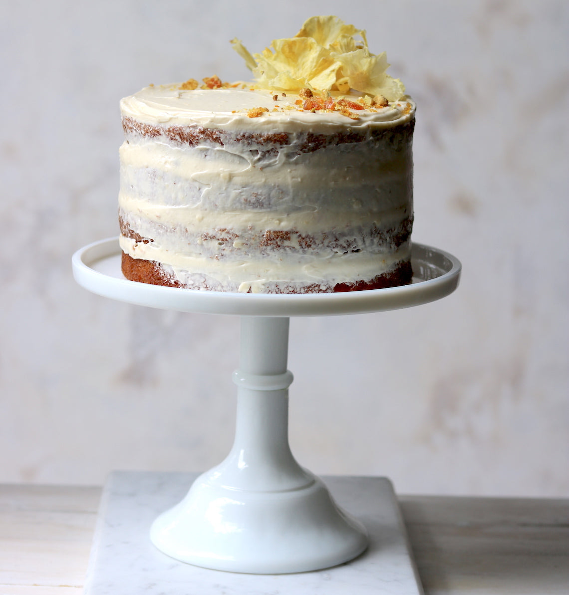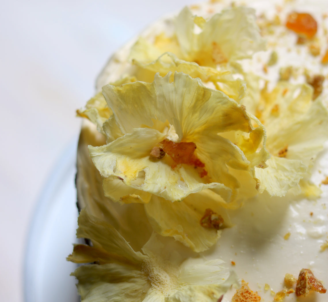 - To assemble the cake, first trim the tops of the cake layers if necessary (if the well you made in the mixture before baking was deep enough you won’t have to do this). Place one cooled cake layer, top side up on a cake stand or serving plate. Spread with ½ cup of the Cream Cheese Frosting and then sprinkle with about 1½ tablespoons of the Orange & Pistachio Praline. Continue to layer with the remaining cake layers, spreading each with ½ cup of frosting and sprinkling with about 1½ tablespoons of praline, and finishing with a cake layer, top side down. Spread a thick layer of frosting over the top of the cake, evening the surface with a large palette knife. Spread any remaining icing around the side of the cake to create a ‘naked’ look. Decorate with the Dried Pineapple Flowers and sprinkle with a little of the remaining praline just before serving.