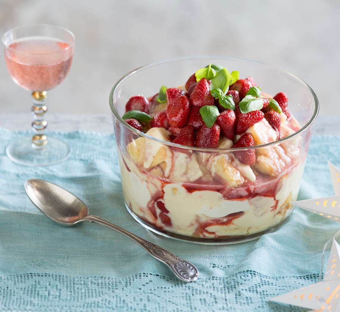 - This trifle can be assembled up to 8 hours ahead of serving. Top with fresh strawberries, dust with icing sugar and decorate with basil just before serving.