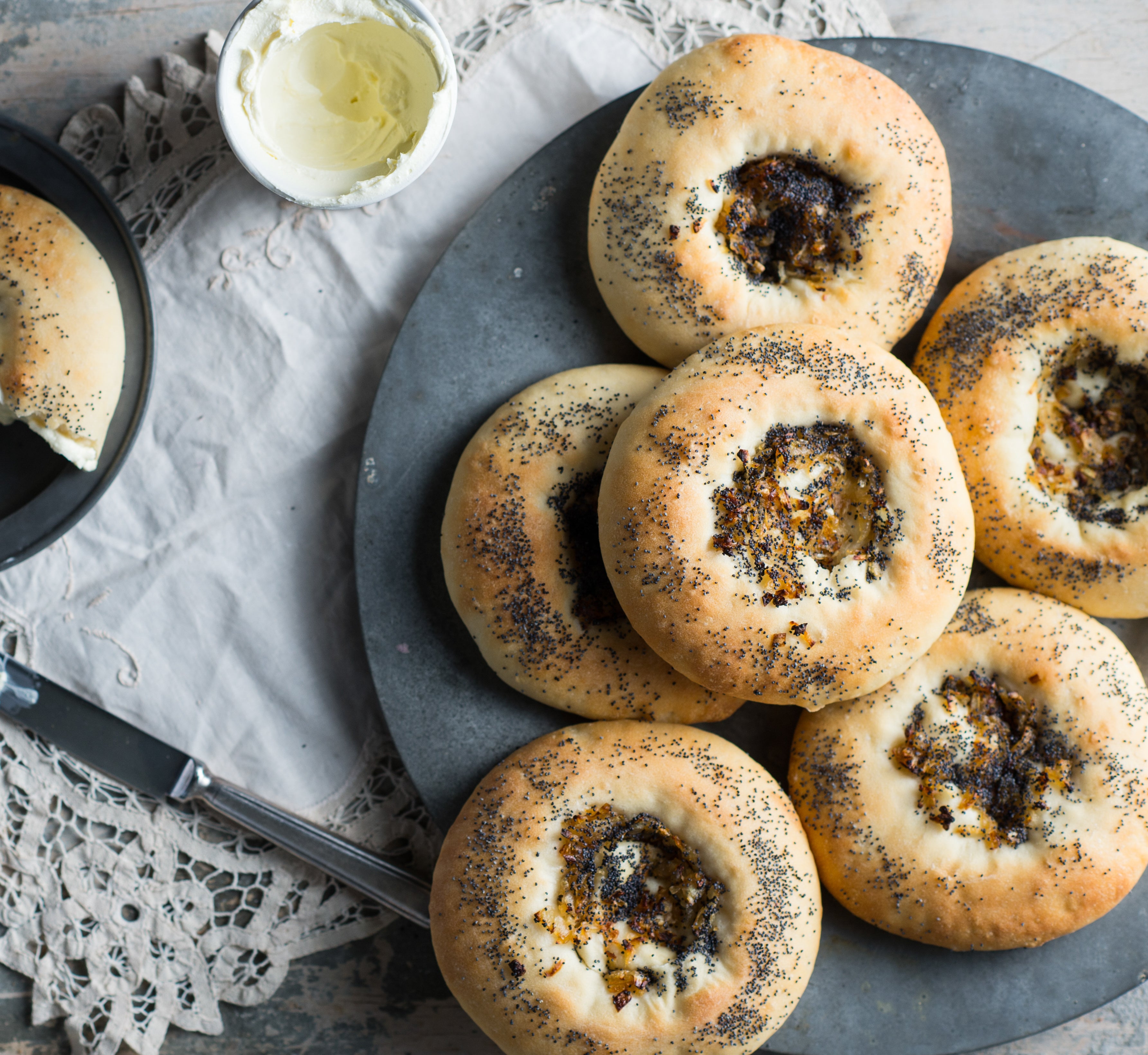 - Use lightly floured fingertips to make an indent in the centre of the dough discs, leaving a 2cm border around the outside. Spoon the onion mixture into the indents, dividing evenly, and then sprinkle with the poppy seeds. Cover with a slightly damp tea towel and set aside in a warm draught-free place for 15 minutes or until slightly puffed.