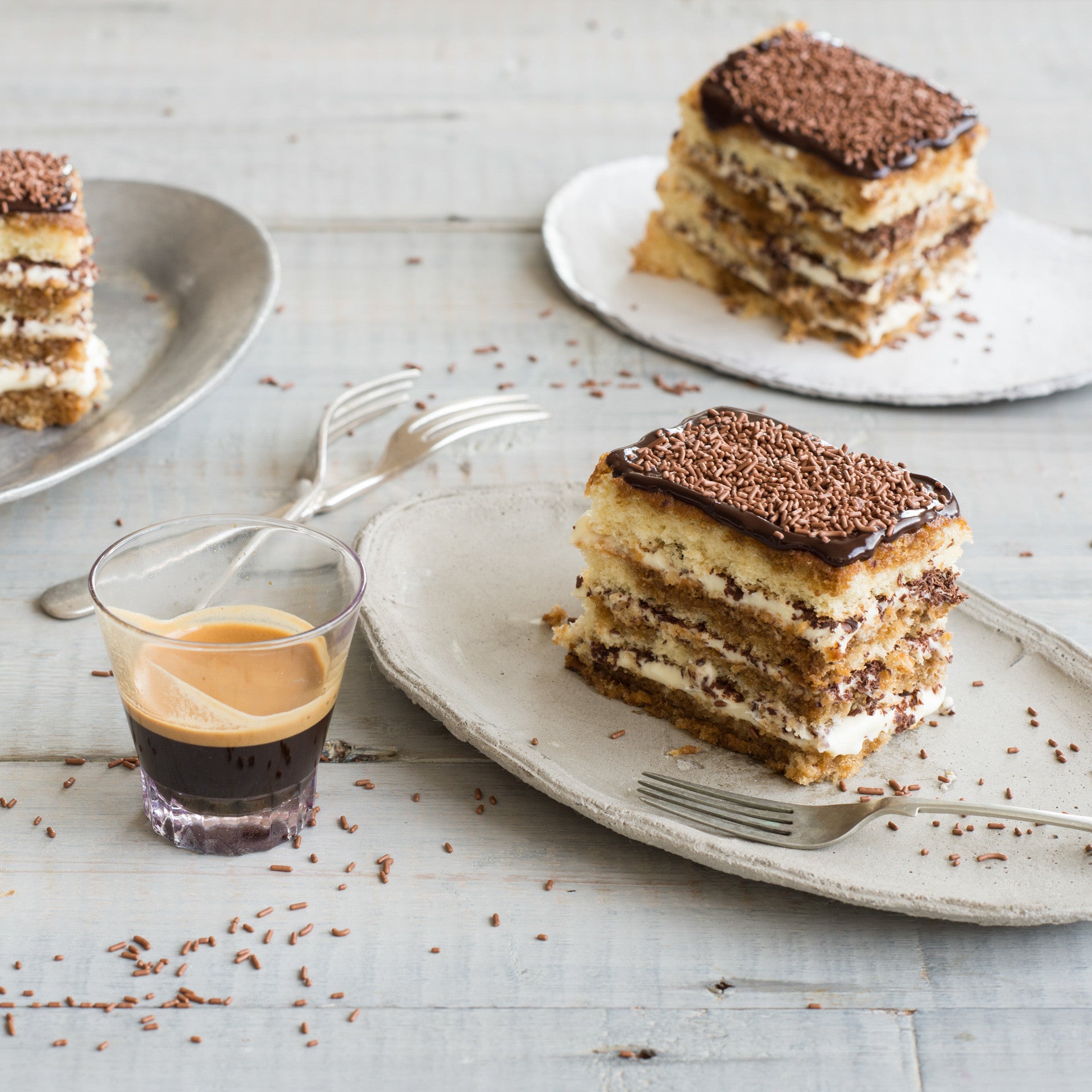 - Cut each of the sponge in half. Combine the coffee and Marsala. Place one sponge layer on the base of the prepared tin and sprinkle with a quarter of the coffee mixture. Spread with a third of the Mascarpone mixture (about ½ cup) and then sprinkle with a third of the grated chocolate. Continue to layer with the remaining sponge, coffee mixture, grated chocolate and mascarpone mixture, finishing with a sponge layer sprinkled with the remaining coffee and Marsala mixture. Cover with plastic wrap and place in the fridge for at least 2 hours or until firm enough to cut.