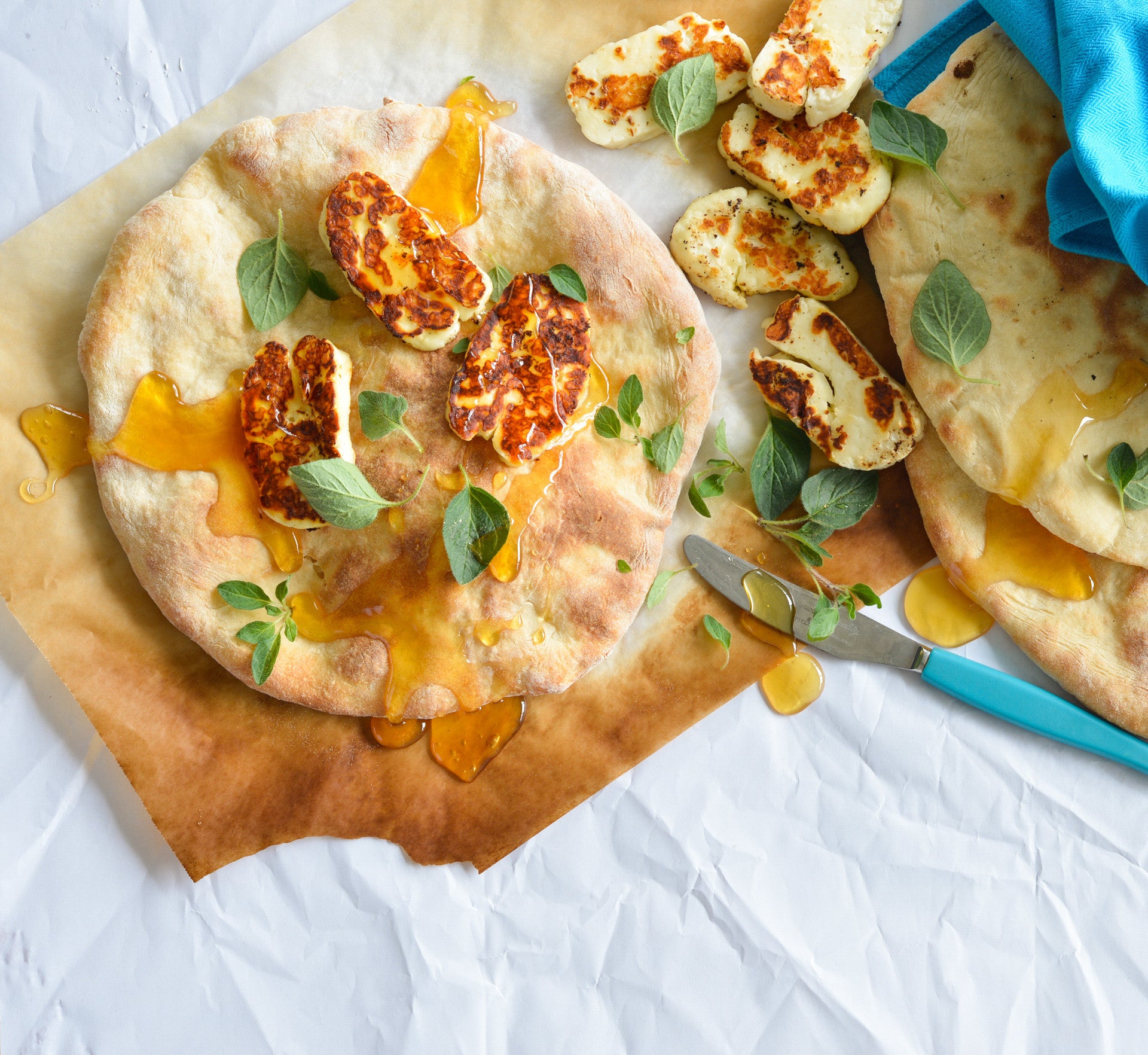 - Serve warm topped with honey, haloumi and oregano leaves.