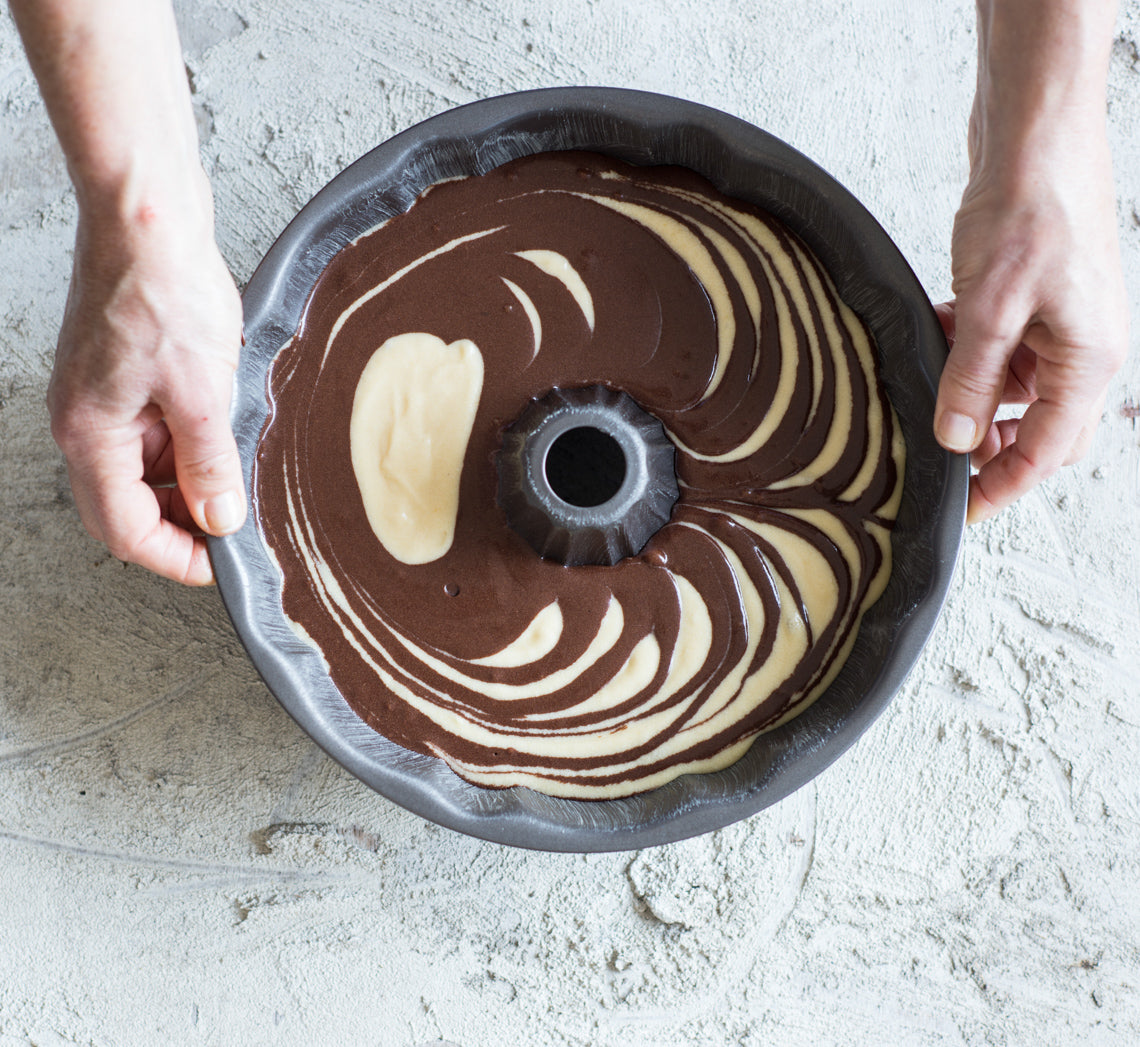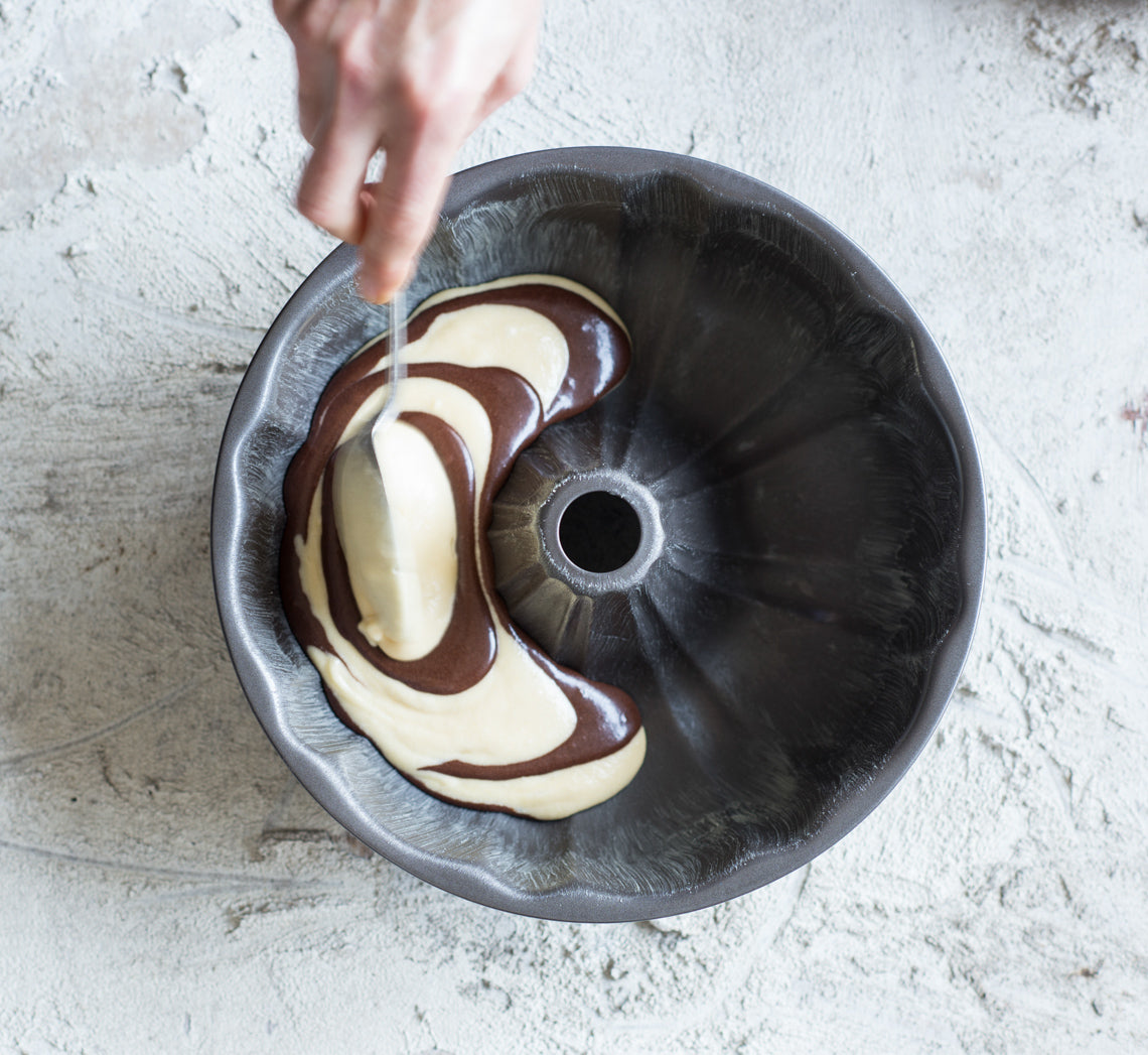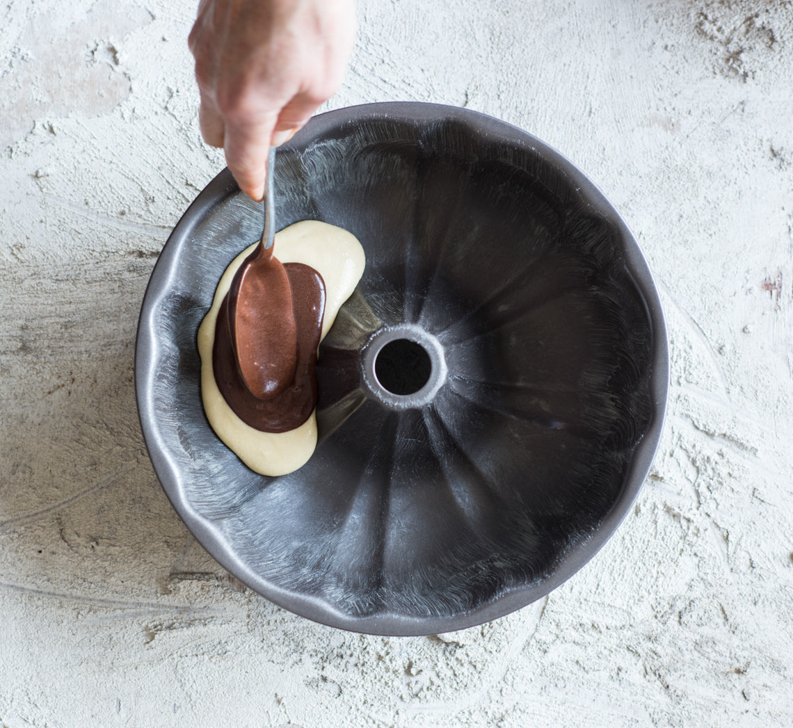 - Drop a large spoonful of the vanilla mixture into the prepared cake tin. Drop a large spoonful of the cocoa mixture into the centre of the vanilla mixture. Continue dropping alternating spoonfuls of the mixtures into the tin directly on top of each other until all the mixture is used. The mixture will spread and even out as you add more, creating the ‘zebra’ pattern.